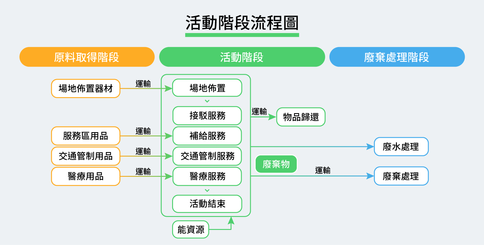 什麼是活動生命週期?在一場大型活動中,每一項物品、每一台車輛、每一度電,都會在「使用前 → 使用中 → 使用後」不同階段產生環境影響。生命週期評估就是將這些影響分成三個階段,完整計算活動的碳排放來源。